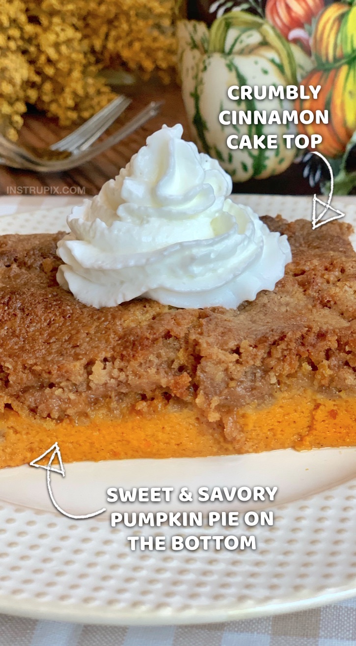 The buttery and crumbly spice cake on top of this easy fall dessert recipe is the perfect complement to the sweet pumpkin pie on the bottom. Add a dollop of whipped cream, and you’ve got some happy tummies. It certainly makes traditional pumpkin pie seem a little boring.
